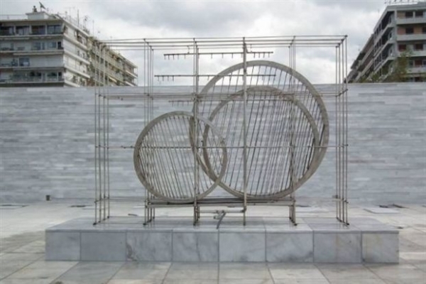 Οι δράστες αφαίρεσαν τον ένα κύκλο από το έργο του Γιώργου Ζογγολόπουλου και τον πέταξαν μακριά από το γλυπτό.