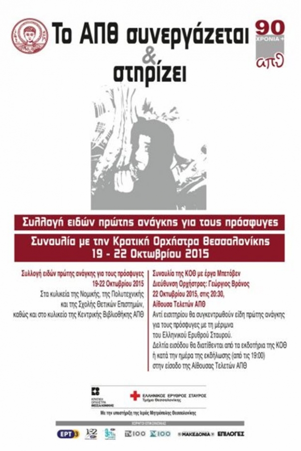 Αναλυτικά, από τη Δευτέρα 19 έως και την Τετάρτη 22 Οκτωβρίου, ώρες 9.00-18.00, θα γίνεται η συλλογή των ειδών στα κυλικεία της Νομικής, της Πολυτεχνικής και της Σχολής Θετικών Επιστημών, καθώς και στο κυλικείο της Κεντρικής Βιβλιοθήκης ΑΠΘ. Επίσης, η Συναυλία της ΚΟΘ με έργα Μπετόβεν, θα διεξαχθεί την Πέμπτη 22 Οκτωβρίου 2015 στις 20.30, στην Αίθουσα Τελετών ΑΠΘ. Στη διεύθυνση της ορχήστρας θα βρίσκεται ο κ. Γεώργιος Βράνος, ενώ το πρόγραμμα θα περιλαμβάνει έργα του συνθέτη που αποτυπώνουν την ευαρέσκειά του για τις ηρωικές πράξεις και τη σταθερή προσήλωσή του στα ουμανιστικά ιδανικά.