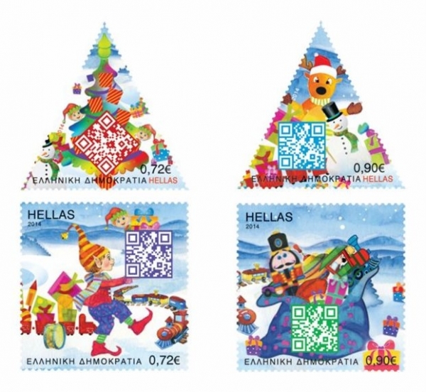 Για πρώτη φορά στην ιστορία τους τα Ελληνικά Ταχυδρομεία (ΕΛΤΑ) εκδίδουν και κυκλοφορούν γραμματόσημα σε τριγωνικό σχήμα που «ψάλλουν» τα ελληνικά παραδοσιακά κάλαντα μέσω γραμμωτού κώδικα (QRC).