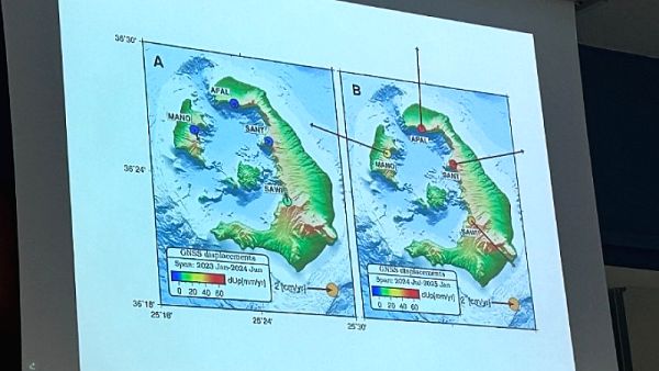 Όπως είπε, από το 2019 το ΑΠΘ και το ΙΜΠΗΣ εγκατέστησαν σταθμούς GNSS για τη γεωδαιτική παρακολούθηση της ηφαιστειακής δραστηριότητας στη Σαντορίνη και το 2025, λειτουργούν συνολικά 32 μόνιμοι σταθμοί στην ευρύτερη περιοχή Σαντορίνης – Ανύδρου. Αναφερόμενος στην έξαρση της σεισμικότητας στην περιοχή Ανύδρου στις αρχές Φεβρουαρίου 2025, ανέφερε ότι τα δεδομένα GNSS κατέγραψαν έντονες και απότομες εδαφικές μετακινήσεις.