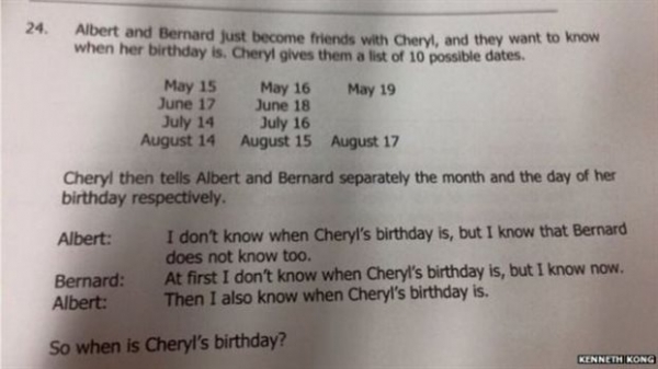 «Ο Άλμπερτ και ο Μπέρναρντ μόλις έγιναν φίλοι με τη Σέριλ και θέλουν να μάθουν πότε είναι τα γενέθλιά της. Η Σέριλ τους δίνει μια λίστα από 10 πιθανές ημερομηνίες.