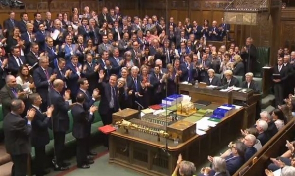 Όρθιοι οι βουλευτές του Συντηρητικού Κόμματος και αρκετοί βουλευτές του Εργατικών, μεταξύ αυτών και ο ηγέτης τους Τζέρεμι Κόρμπιν, χειροκρότησαν τον Κάμερον στο Κοινοβούλιο, όπου απάντησε για τελευταία φορά ερωτήσεις ως πρωθυπουργός.