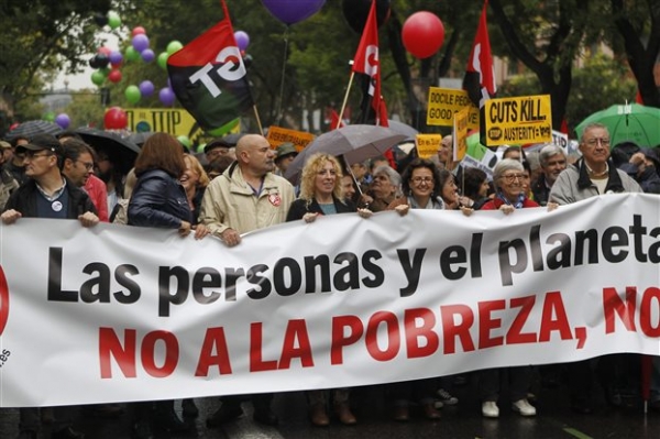 Οι διαδηλωτές τόνισαν ότι στην Ισπανία, το ποσοστό των προσώπων που αντιμετωπίζουν τον κίνδυνο της φτώχειας αυξήθηκε κατά 4,7% μέσα σε έξι χρόνια: από το 24,5% το 2008 στο 29,2% το 2014, σύμφωνα με τη Eurostat, τη στατιστική υπηρεσία της ΕΕ.