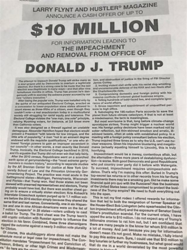 Have dirt that could impeach President Trump? Hustler publisher Larry Flynt says he'll pay you $10 million. https://t.co/BYkMzR5nsD