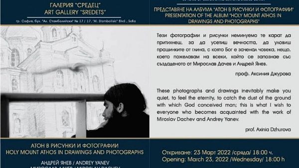 Η έκθεση με τίτλο «Το Άγιο Όρος σε Σχέδια και Φωτογραφίες», του καλλιτέχνη Αντρέι Γιάνεφ και του φωτογράφου καθηγητή Μίροσλαβ Ντάσεφ, Πρύτανη της Βουλγαρικής Ακαδημίας Θεάτρου και Κινηματογράφου, θα παρουσιαστεί από τις 20 Νοεμβρίου έως τις 4 Δεκεμβρίου στο Βυζαντινό και Χριστιανικό Μουσείο στην Αθήνα, ανακοίνωσε η πρεσβεία της Βουλγαρίας στην Ελλάδα.