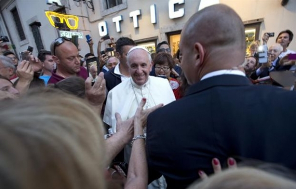 Ο Πάπας παρέμεινε στο κατάστημα για 40 λεπτά και έφυγε χαμογελαστός περνώντας ανάμεσα από τον κόσμο που είδε έκπληκτος τον Φραγκίσκο στην καρδιά της Ρώμης.