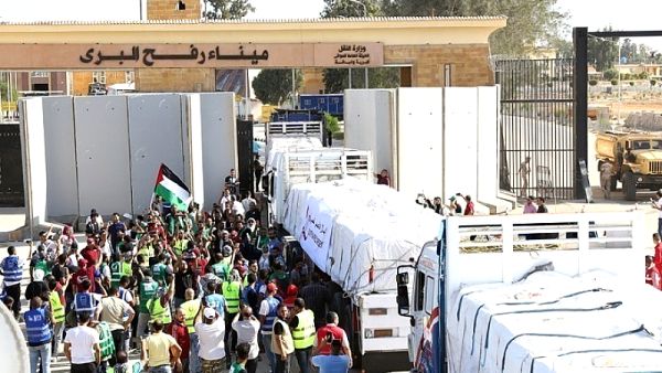 Βίντεο που μετέδωσε το Reuters δείχνει μια πρώτη ομάδα φορτηγών – ανάμεσά τους και βυτιοφόρα γεμάτα καύσιμα – να κινείται από την αιγυπτιακή πλευρά των συνόρων προς το πέρασμα της Ράφα σήμερα τα ξημερώματα.
