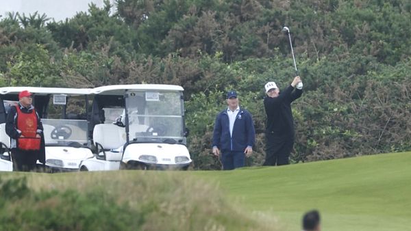 Υπό βροχή και με τη συνοδεία του γιου του Έρικ, ο Αμερικανός πρόεδρος έριξε τα πρώτα του χτυπήματα στο γήπεδο του γκολφ, στο πολυτελές συγκρότημα ιδιοκτησίας της οικογένειας Τραμπ. Η άφιξη του επικεφαλής του αμερικανικού κράτους χθες το βράδυ στο Τέρνμπερι μετέτρεψε αυτήν τη γραφική και συνήθως ήσυχη περιοχή στη νοτιοδυτική Σκωτία σε ένα πραγματικό οχυρό.