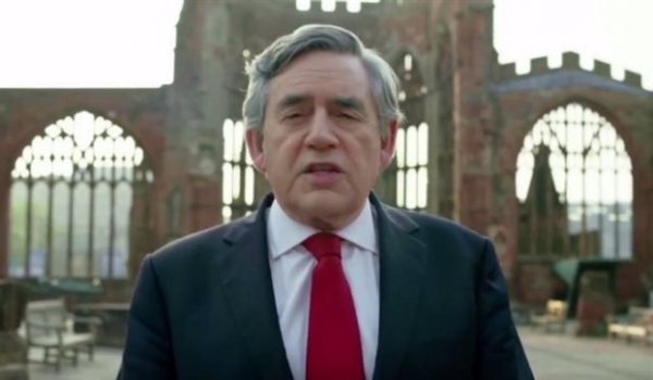 Ο Γκόρντον Μπράουν μιλά στους Βρετανούς περπατώντας στα ερείπια του Καθεδρικού του Κόβεντρι που βομβαρδίστηκε και καταστράφηκε από τα ναζιστικά μαχητικά 75 χρόνια πριν «και ο οποίος σήμερα διατηρείται ως μνημείο των πολέμων που αφήσαμε πίσω και του 'ιερού' της ειρήνης», όπως σημειώνει στη θερμή έκκλησή του προς τους Βρετανούς να στηρίξουν την παραμονή στην Ένωση.