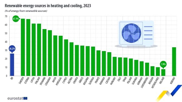 Μεταξύ των χωρών της ΕΕ, η Σουηδία ήταν και πάλι πρώτη το 2023 σε ό,τι αφορά την ανανεώσιμη ενέργεια στη θέρμανση και τον κλιματισμό, με μερίδιο 67,1%, και ακολουθεί η Εσθονία (66,7%). Αμφότερες οι χώρες χρησιμοποιούν κυρίως βιομάζα και αντλίες θερμότητας. Ακολουθεί η Λετονία (61,4%), η οποία βασίζεται κυρίως στη βιομάζα.