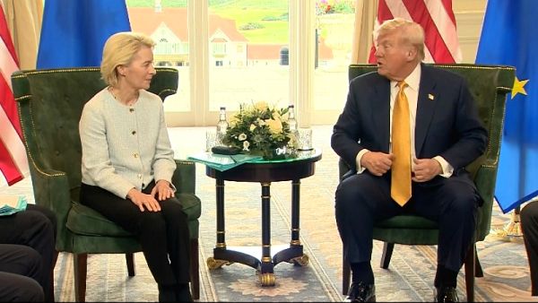 Ο πρόεδρος των ΗΠΑ Ντόναλντ Τραμπ και η πρόεδρος της Ευρωπαϊκής Επιτροπής Ούρσουλα φον ντερ Λάιεν κατέληξαν σήμερα σε μια δασμολογική συμφωνία κατά τη διάρκεια μιας συνάντησης-εξπρές στο Τέρνμπερι της Σκωτίας.