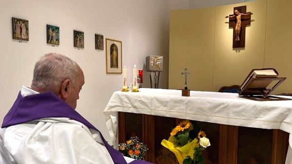Η αίθουσα τύπου του Βατικανού απέστειλε σήμερα στα μέσα ενημέρωσης φωτογραφία του πάπα Φραγκίσκου, προφίλ, ενώ ιερουργεί στο παρεκκλήσι του νοσοκομείου Αγκοστίνο Τζεμέλι της Ρώμης, στο οποίο εισήχθη στις 14 του περασμένου Φεβρουαρίου.