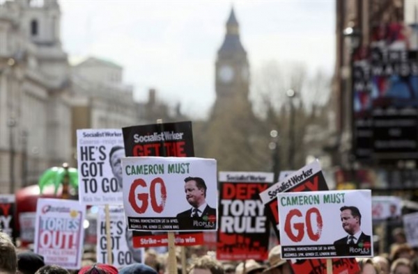 Την ίδια ώρα, και μόλις δύο χιλιόμετρα πιο μακριά, αρκετές εκατοντάδες διαδηλωτές είχαν συγκεντρωθεί στη Ντάουνινγκ Στριτ ζητώντας την παραίτησή του. «Κάμερον πρέπει να φύγεις» φώναζαν οι συγκεντρωμένοι, ορισμένοι φορώντας καπέλα Παναμά και άλλοι, πιο τολμηροί, χαβανέζικα πουκάμισα.