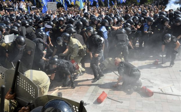 Την ώρα που η ουκρανική Βουλή ενέκρινε σχέδιο συνταγματικής μεταρρύθμισης που δίνει περισσότερη αυτονομία στις εξεγερμένες φιλορωσικές ανατολικές περιοχές -μέρος της συμφωνίας του Μινσκ- αρκοδεξιοί συγκεντρωμένοι μπροστά από τη Βουλή πυροδότησαν το αιματηρό χάος.