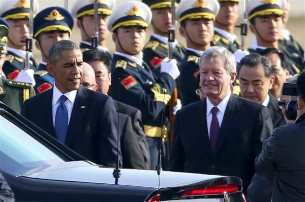 Το αμερικανικό προεδρικό αεροπλάνο Air Force One προσγειώθηκε στο διεθνές αεροδρόμιο του Πεκίνου, όπου τον πρόεδρο Ομπάμα υποδέχθηκαν ο κινέζος υπουργός Εξωτερικών Ουάνγκ Γι και ο δήμαρχος του Πεκίνου Ουάνγκ Ανσούν, κάτω από έναν καταγάλανο ουρανό. Το Πεκίνο όπου τα επίπεδα της ατμοσφαιρικής ρύπανσης είναι πολύ υψηλά έλαβε δραστικά μέτρα για να διαλύσει την πυκνή αιθαλομίχλη που σκεπάζει την πόλη, πριν φιλοξενήσει τη σύνοδο του οργανισμού Οικονομικής Συνεργασίας Ασίας-Ειρηνικού (APEC).