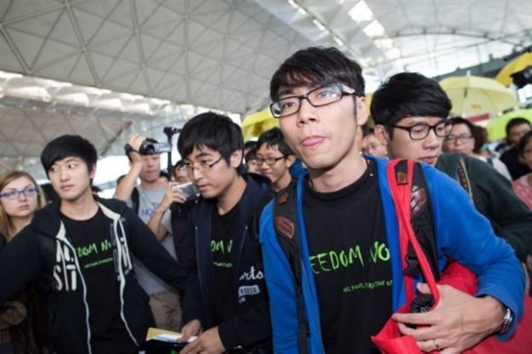 Δεκάδες άτομα είχαν συγκεντρωθεί στο αεροδρόμιο προκειμένου να αποχαιρετήσουν τους τρεις φοιτητές. Όλοι τους κρατούσαν τις κίτρινες ομπρέλες, οι οποίες έγιναν σύμβολο των διαδηλώσεων των περασμένων εβδομάδων.
