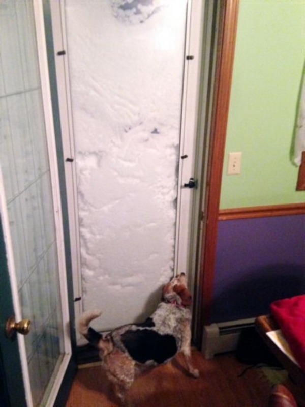 Αρκετοί κάτοικοι ανεβάζουν στο Διαδίκτυο φωτογραφίες από ανοιγμένες εξώπορτες των σπιτιών του που είναι μέχρι πάνω μπλοκαρισμένες με χιόνι.