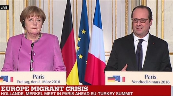 Ο γάλλος πρόεδρος υποδέχτηκε υπό βροχή την Άνγκελα Μέρκελ στο Ελιζέ με στόχο να συντονίσουν την στάση του γαλλογερμανικού άξονα ενόψει της κρίσιμης Συνόδου Κορυφής της Δευτέρας για το προσφυγικό. Από το Μέγαρο των Ηλυσίων, Μέρκελ και Ολάντ είχαν επίσης τηλεφωνική επικοινωνία με τον Ιταλό πρωθυπουργό Ματέο Ρέντσι και τον Ρώσο πρόεδρο, Βλαντιμίρ Πούτιν.
