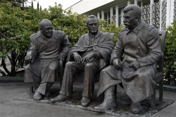 Στο μνημείο ο Αμερικανός πρόεδρος Ρούζβελτ κάθεται στη μέση έχοντας δεξιά του τον Βρετανό πρωθυπουργό Τσόρτσιλ και αριστερά του τον Σταλιν. Οι δυο δυτικοί ηγέτες έχουν ύψος 3.20 μετρ α αλλά ο σοβιετικός ηγέτης είναι κατά 10 εκατοστά υψηλότερος.