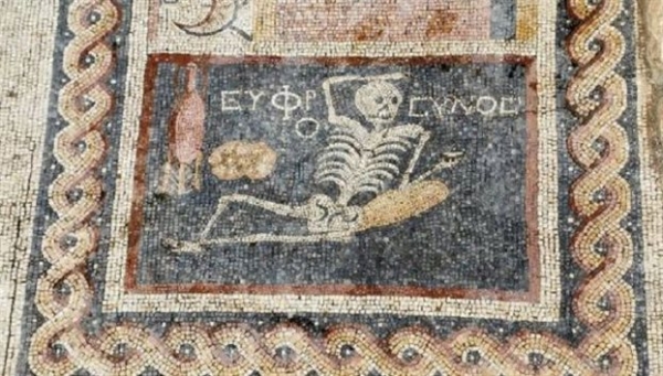 Το μωσαϊκό χρονολογείται από τον 3ο αιώνα π.Χ. και πιστεύεται ότι κοσμούσε την «τραπεζαρία» ενός σπιτιού. Αμφορείς και ψωμί περιβάλλουν τον σκελετό.