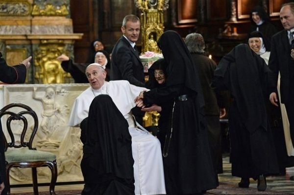 Οι μοναχές που έθεσαν σε... κλοιό τον ποντίφικα γεμίζοντάς τον με δώρα είναι εσώκλειστες -κανονικά βλέπουν όσους επισκέπτες φθάνουν στη μονή τους μέσα από χώρισμα- αλλά έλαβαν ειδική άδεια να παραστούν στην ομιλία που εκφώνησε ο Πάπας στο Καθεδρικό Ναό προς ιερείς και καλόγριες.