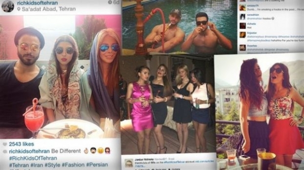Στη διεύθυνση «RichKidsofTehran», τα «Πλούσια Παιδιά της Τεχεράνης», αγόρια και κορίτσια εμφανίζονται να ποζάρουν άλλοτε στο εσωτερικό μιας Ferrari ή μιας Maserati και άλλοτε σε πισίνες ή εστιατόρια πολυτελών ξενοδοχείων όπου πίνουν και ξεφαντώνουν συχνά φορώντας μόνο τα μαγιό τους, ενώ αρκετές φορές πρωταγωνιστούν και σε βίντεο από παράνομους αγώνες ταχύτητας στους οποίους συμμετέχουν οδηγώντας τα πανάκριβα αυτοκίνητά τους στους δρόμους και στις λεωφόρους των αριστοκρατικών συνοικιών της πρωτεύουσας του Ιράν.