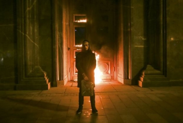 Βίντεο δείχνει τον Πιοτρ Παβλένσκι να στέκεται στην πλατεία Λουμπιάνκα, στην καρδιά της ρωσικής πρωτεύουσας, μπροστά από το κτίριο της FSB, όπου τη σοβιετική εποχή ανακρίνονταν πολιτικοί κρατούμενοι. Φλόγες έχουν τυλίξει την είσοδό του κτιρίου και τις δύο βαριές ξύλινες πόρτες του.