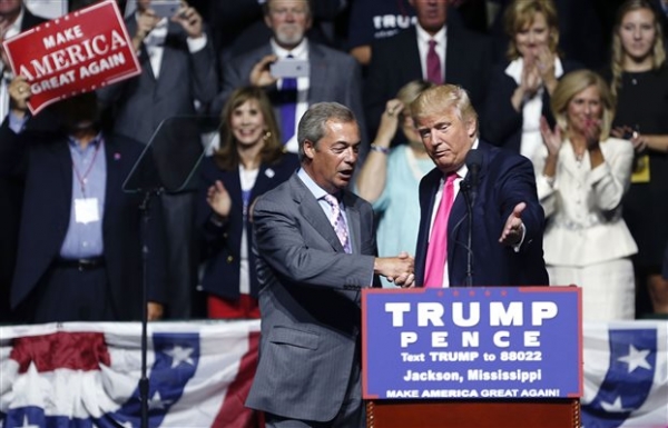 Ο Νάιτζελ Φάρατζ, που είχε πριν τις αμερικανικές εκλογές, συνταχθεί μαχητικά με τον Τραμπ (εμφανιζόμενος και σε συγκεντρώσεις του) ήταν ο πρώτος ευρωπαίος πολιτικός που συναντήθηκε με τον ρεπουμπλικανό μετά την εκλογή του.