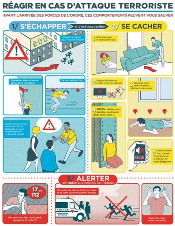 S’ECHAPPER, SE CACHER, ALERTER, des instructions pour reagir en cas d’attaque terroriste >> https://t.co/dMayQn85U4pic.twitter.com/dLImHFgzLn