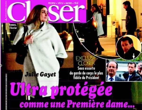 Σήμερα, το ίδιο έντυπο δημοσιεύει φωτογραφίες της 42χρονης ηθοποιού σε επίσκεψή της στη δυτική πόλη Ρεν με «κρατικό αυτοκίνητο» συνοδευόμενη από έναν από τους σωματοφύλακες του Ολάντ.