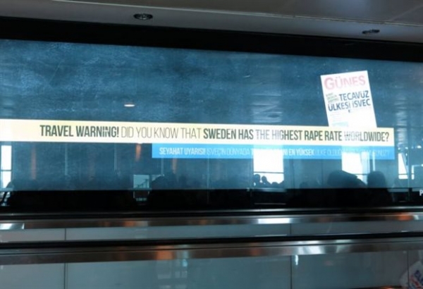 «Ταξιδιωτική προειδοποίηση: Ξέρετε πως η Σουηδία έχει το υψηλότερο ποσοστό βιασμών παγκοσμίως;» έγραφε η γιγαντοαφίσα που βρίσκεται κατά μήκος κυλιόμενου διαδρόμου στο τμήμα αναχωρήσεων του διεθνούς τέρμιναλ του αεροδρομίου Ατατούρκ.