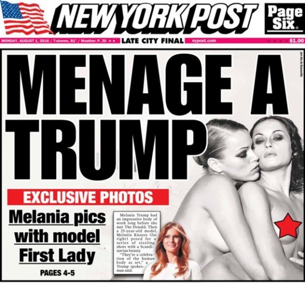 Η φωτογραφία που δημοσιεύεται τη Δευτέρα δείχνει τη Μελάνια σε ένα κρεβάτι να σφίγγει στην αγκαλιά της μία άλλη επίσης γυμνή γυναίκα με πηχυαίο τίτλο: «Menage a Trump», που παραφράζει το Menage a trois (Ερωτικό τρίγωνο).