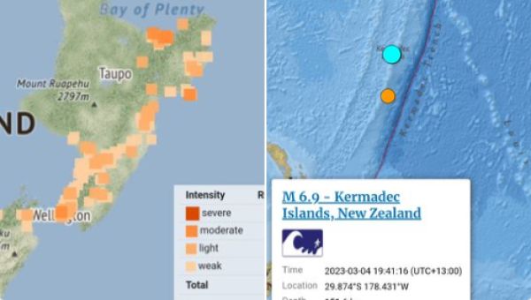 Prelim M6.9 earthquake has occurred in the Kermadec Islands, N of New Zealand. This earthquake was reported felt by over 500 people along the E.coast of the N.Island and the Wellington region. If you felt it, please report it below to Geonet. https://t.co/2if8hTuMI5pic.twitter.com/9A2xgAXUyD