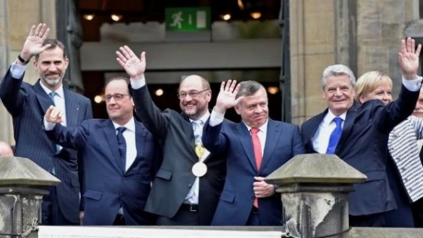 Στην τελετή, η οποία πραγματοποιήθηκε στο δημαρχείο του Ααχεν, το «παρών» έδωσαν, μεταξύ άλλων, οι βασιλείς της Ισπανίας και της Ιορδανίας Φίλιππος και Αμπντάλα, ο πρόεδρος της Ουκρανίας Πέτρο Ποροσένκο, ο πρόεδρος του Ευρωπαϊκού Συμβουλίου Ντόναλντ Τουσκ και ο πρόεδρος της Ευρωπαϊκής Επιτροπής Ζαν-Κλοντ Γιούνκερ.