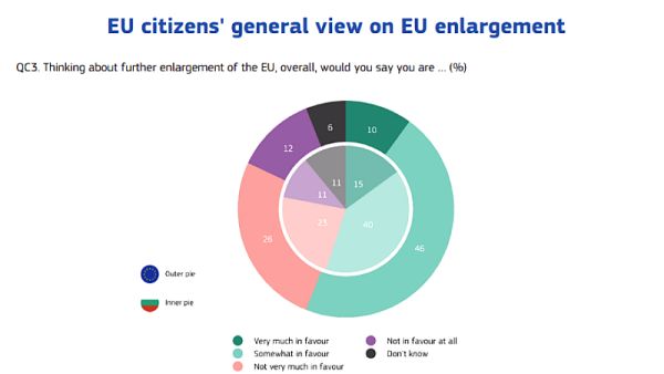 Σχεδόν τέσσερις στους δέκα Βούλγαρους τάσσονται ως έναν βαθμό υπέρ της περαιτέρω διεύρυνσης της ΕΕ, σύμφωνα με έρευνα του Ευρωβαρόμετρου που δόθηκε σήμερα στη δημοσιότητα από την Ευρωπαϊκή Επιτροπή.