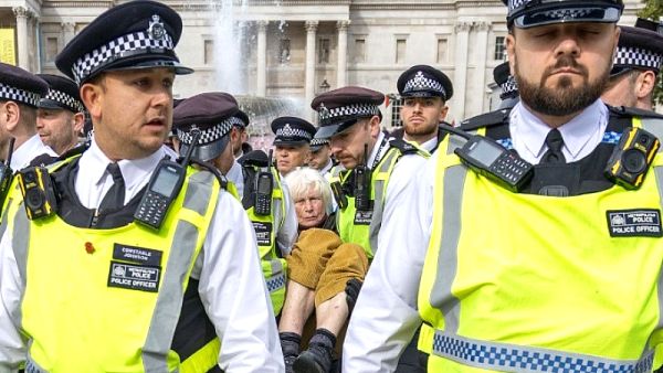 Αστυνομικοί συνέλαβαν διαδηλωτές στην πλατεία Τραφάλγκαρ οι οποίοι έγραφαν συνθήματα σε πανό δηλώνοντας την υποστήριξή τους στην Palestine Action, η οποία απαγορεύθηκε τον Ιούλιο αφού μέλη της διείσδυσαν σε αεροπορική βάση και προκάλεσαν ζημιές σε στρατιωτικά αεροπλάνα.
