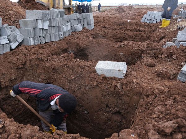 Στην πόλη Τζαντάρις, στην επαρχία του Αφρίν, πολύ κοντά στα σύνορα με την Τουρκία, οι νεκροί από το σεισμό της Δευτέρας είναι τόσοι πολλοί που έχουν ανοιχτεί ομαδικοί τάφοι για την ταφή τους. Τη διακασία της ταφής, ακόμα και στο θρησκευτικό της κομμάτι, τη διεκπεραιώνουν εθελοντές που πολλές φορές έρχονται από μακριά.