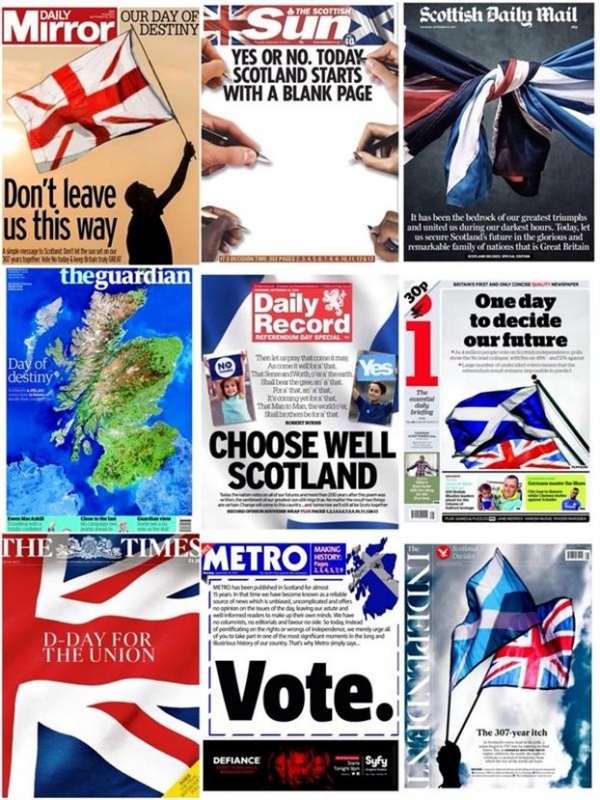 «Σκωτία: η ημέρα της αναμέτρησης» είναι ο δραματικός τίτλος της «The Herald», ενώ στο ίδιο μήκος κύματος και ο Guardian κάνει λόγο για την «Μοιραία ημέρα».