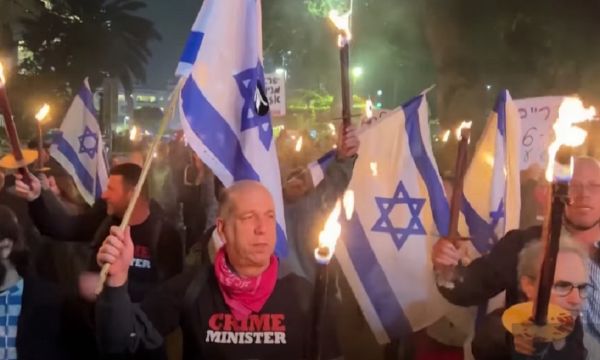 Ανεμίζοντας σημαίες του Ισραήλ και της κοινότητας ΛΟΑΤΚΙ+, οι διαδηλωτές σήκωσαν πανό που υπενθύμιζαν τις κατηγορίες για διαφθορά σε βάρος του πρωθυπουργού Νετανιάχου, ξυπνώντας μνήμες από το κίνημα διαμαρτυρίας του 2020 που ζητούσε την απομάκρυνσή του από την εξουσία.