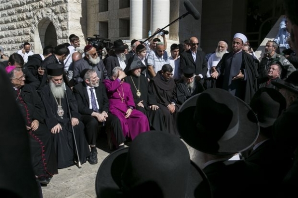 Διαθρησκειακή έκκληση για ειρήνευση από το χώρο της συναγωγής που έγινε η επίθεση, με απόντες όμως τους υψηλόβαθμους θρησκευτικούς ηγέτες εβραίων και μουσουλμάνων.