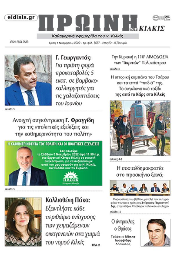 Διαβάστε το νέο πρωτοσέλιδο της Πρωινής του Κιλκίς, μοναδικής καθημερινής εφημερίδας του ν. Κιλκίς (1-11-2022)