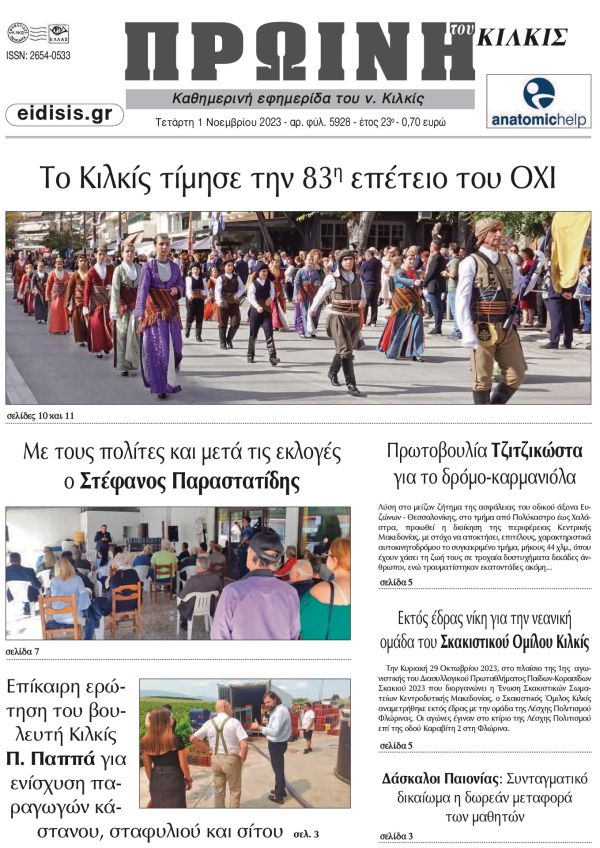 Διαβάστε το νέο πρωτοσέλιδο της Πρωινής του Κιλκίς, μοναδικής καθημερινής εφημερίδας του ν. Κιλκίς (1-11-2023)