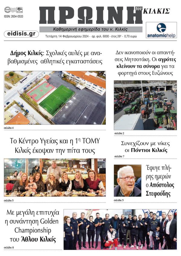 Διαβάστε το νέο πρωτοσέλιδο της Πρωινής του Κιλκίς, μοναδικής καθημερινής εφημερίδας του ν. Κιλκίς (14-2-2024)