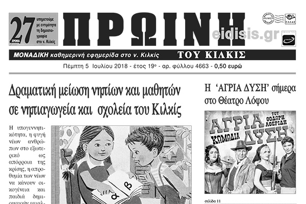 Διαβάστε το νέο πρωτοσέλιδο της Πρωινής του Κιλκίς, μοναδικής καθημερινής εφημερίδας του ν. Κιλκίς