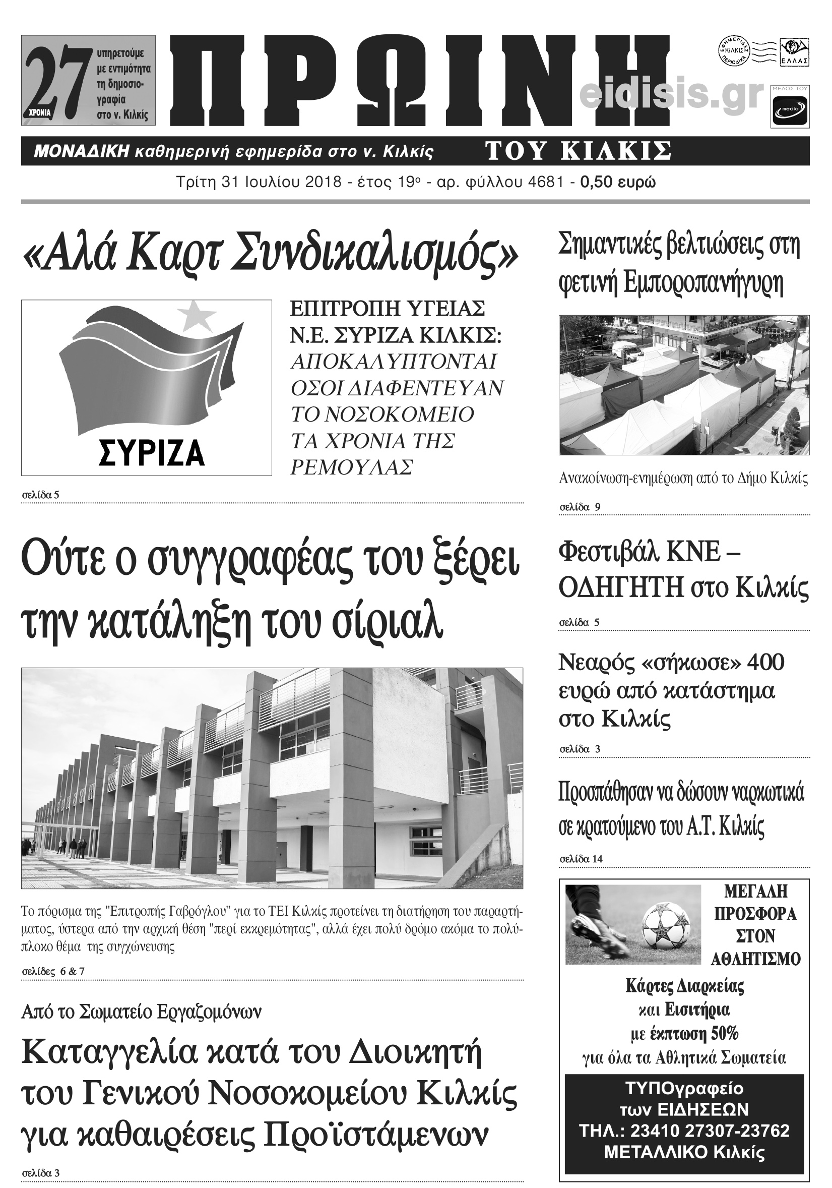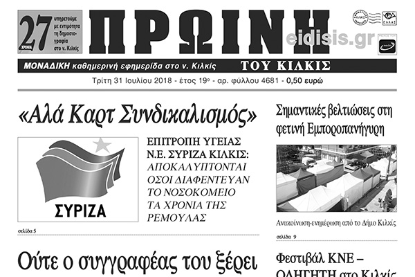 Διαβάστε το νέο πρωτοσέλιδο της Πρωινής του Κιλκίς, μοναδικής καθημερινής εφημερίδας του ν. Κιλκίς