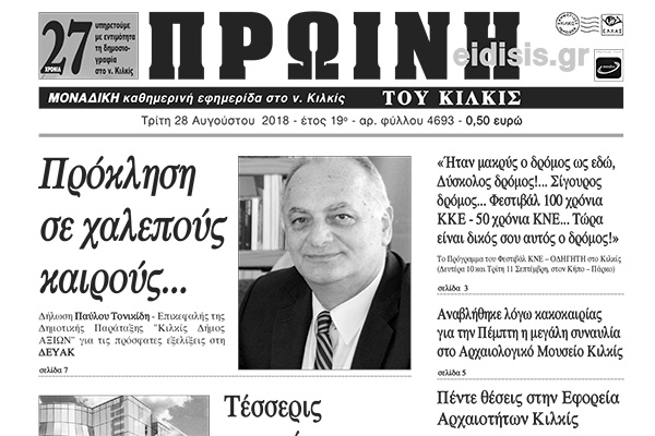 Διαβάστε το νέο πρωτοσέλιδο της Πρωινής του Κιλκίς, μοναδικής καθημερινής εφημερίδας του ν. Κιλκίς