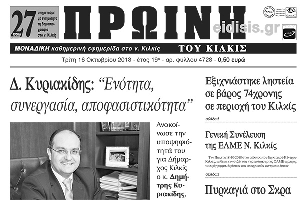 Διαβάστε το νέο πρωτοσέλιδο της Πρωινής του Κιλκίς, μοναδικής καθημερινής εφημερίδας του ν. Κιλκίς