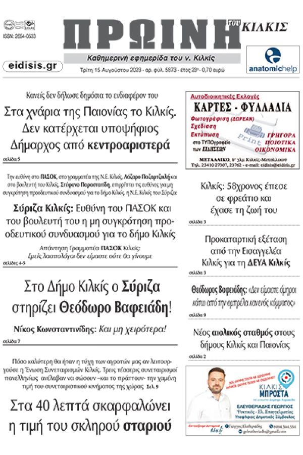 Διαβάστε το νέο πρωτοσέλιδο της Πρωινής του Κιλκίς, μοναδικής καθημερινής εφημερίδας του ν. Κιλκίς (15-8-2023)