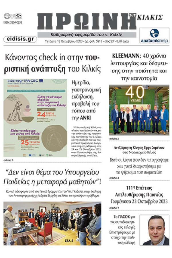 Διαβάστε το νέο πρωτοσέλιδο της Πρωινής του Κιλκίς, μοναδικής καθημερινής εφημερίδας του ν. Κιλκίς (18-10-2023)