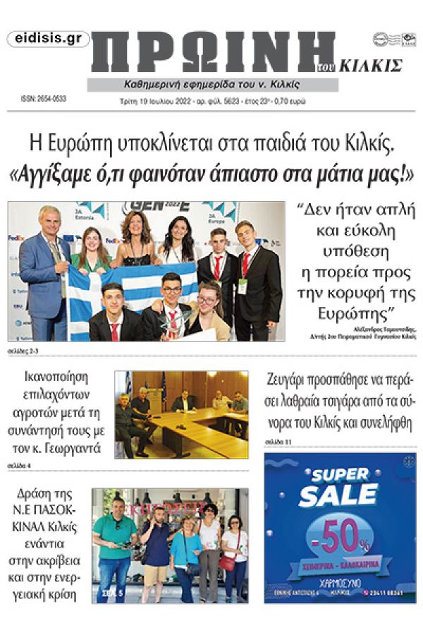 Διαβάστε το νέο πρωτοσέλιδο της Πρωινής του Κιλκίς, μοναδικής καθημερινής εφημερίδας του ν. Κιλκίς (19-7-2022)